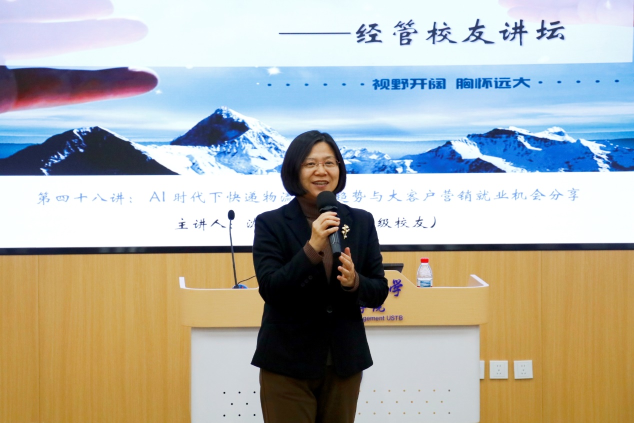 4月8日下午,学院“管理大视野——经管校友讲坛”第四十八讲在经管楼312举行。学院国贸00级校友,中国邮政速递物流股份有限公司市场部副总经理沈静受邀以《AI时代快递物流行业趋势与大客户营销就业机会》为题作分享。讲座由学院党委书记武森主持。