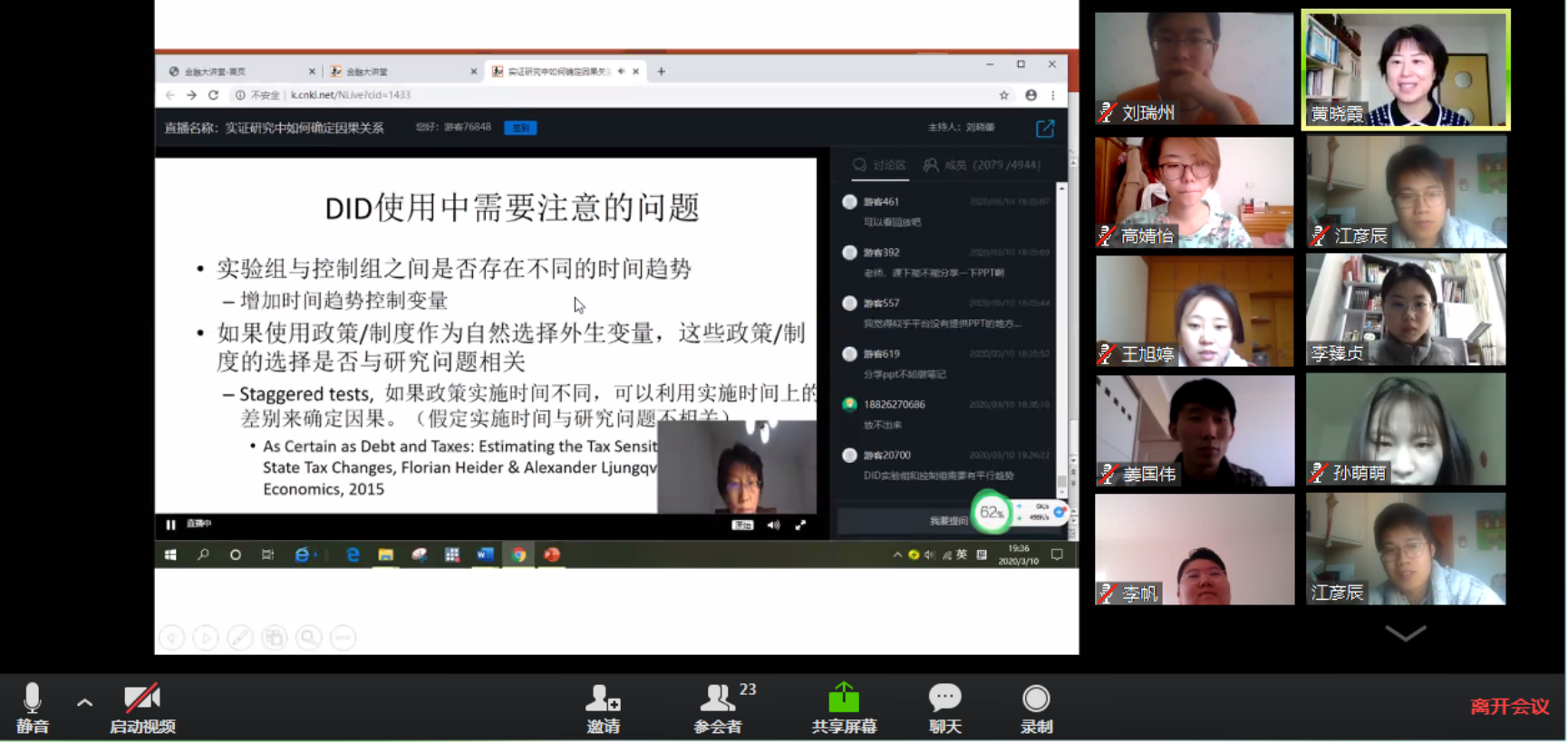 借助于在线视频通讯软件,91麻豆教师指导学生的各类例会和研讨活动未受影响,依然有序进行。例如,金融工程系黄晓霞教授通用会畅通讯软件,每周组织一场科研例会,平均每场参与人数在20人以上,学生分布于黑龙江、河南、山西和北京等地。