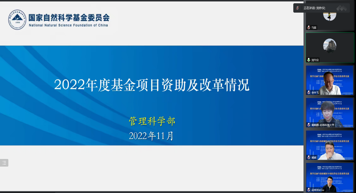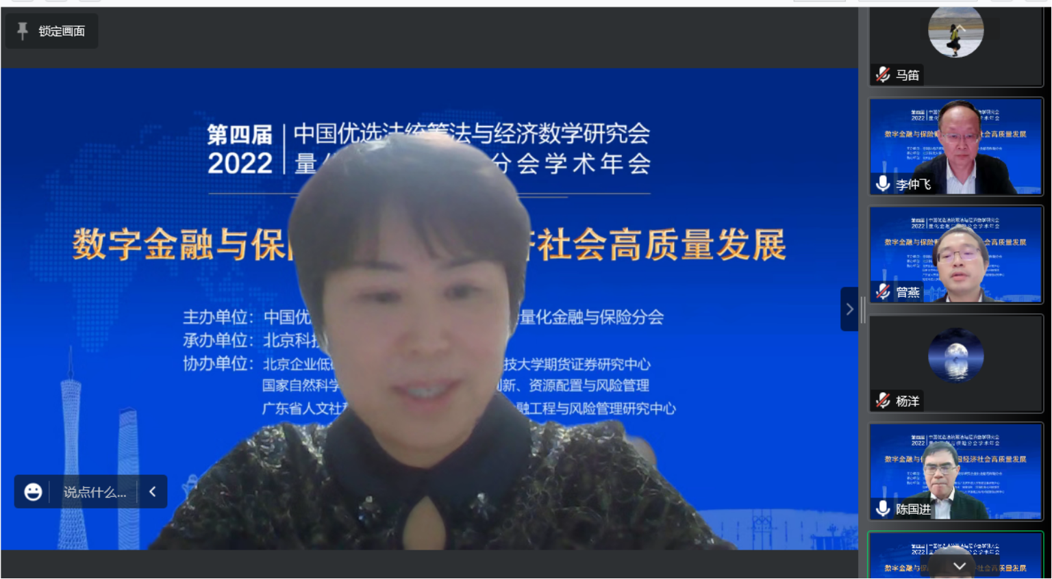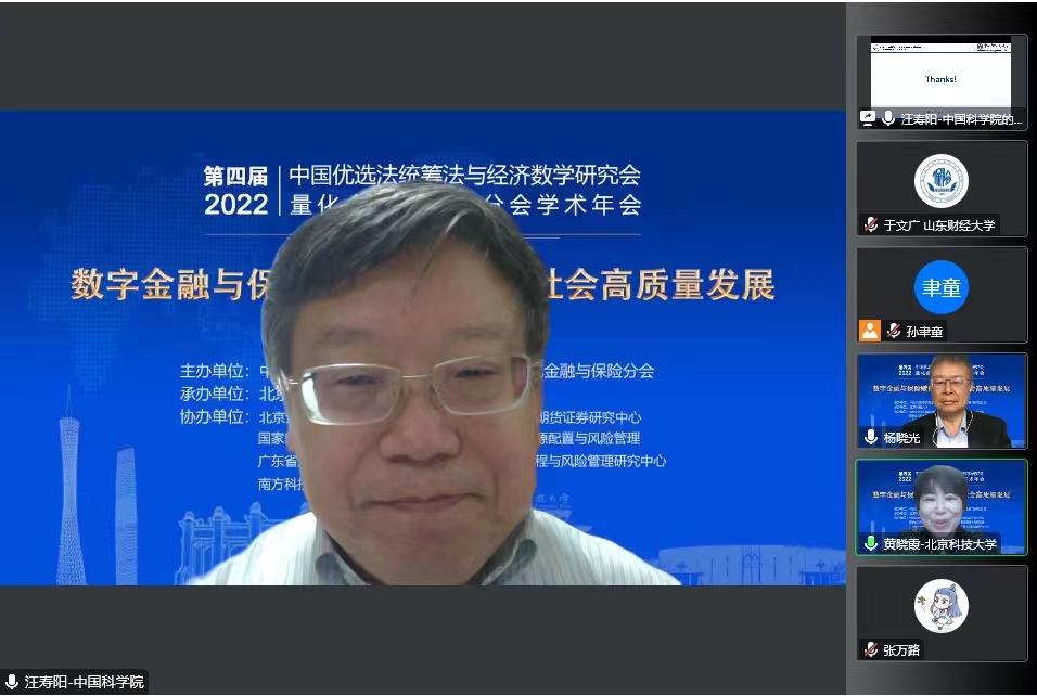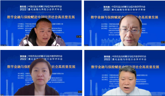 开幕式后,由国家自然科学基金委管理科学部副主任刘作仪、哥伦比亚大学的周迅宇教授、中国科91麻豆的汪寿阳院士和中国科91麻豆系统科学研究所副所长杨晓光研究员作大会报告。首先,刘作仪主任作了题为《2022年度基金项目资助及改革情况》的大会报告,详细介绍了2022年度管理学部基金资助情况和改革情况。然后,周迅宇教授作了题为《ReinforcementLearninginContinuousTimewithFinancialApplications》的大会报告,介绍了无模型连续时间强化学习及其在金融资产管理中的应用。上半场大会报告由大会主席李仲飞理事长主持。汪寿阳教授作了题为《加密货币的几个问题》的大会报告,从比特币挖矿谈起,通过几个案例来分析数字经济时代风险管理的一些新问题,并针对这些新问题,提出新理论、新方法与新技术,促进数字经济风险管理理论的研究与发展。最后,杨晓光研究员作了题为《数字经济的内在逻辑》的大会报告,报告指出了从卖方经济到买方经济的人类行为的变化,使得互联网和信息技术全面赋能经济各个环节,并阐述了数字经济的经济产出中市场和数据要素的重要性。下半场大会报告由91麻豆 副院长黄晓霞教授主持。大会报告内容丰富、精彩纷呈,为参会人员呈现了一场量化金融与保险前沿研究的思想盛宴。大会报告期间通过腾讯会议参与大会报告学习讨论的人数达到了300上限,同时还有近500人通过线上直播的方式参与大会报告的学习。