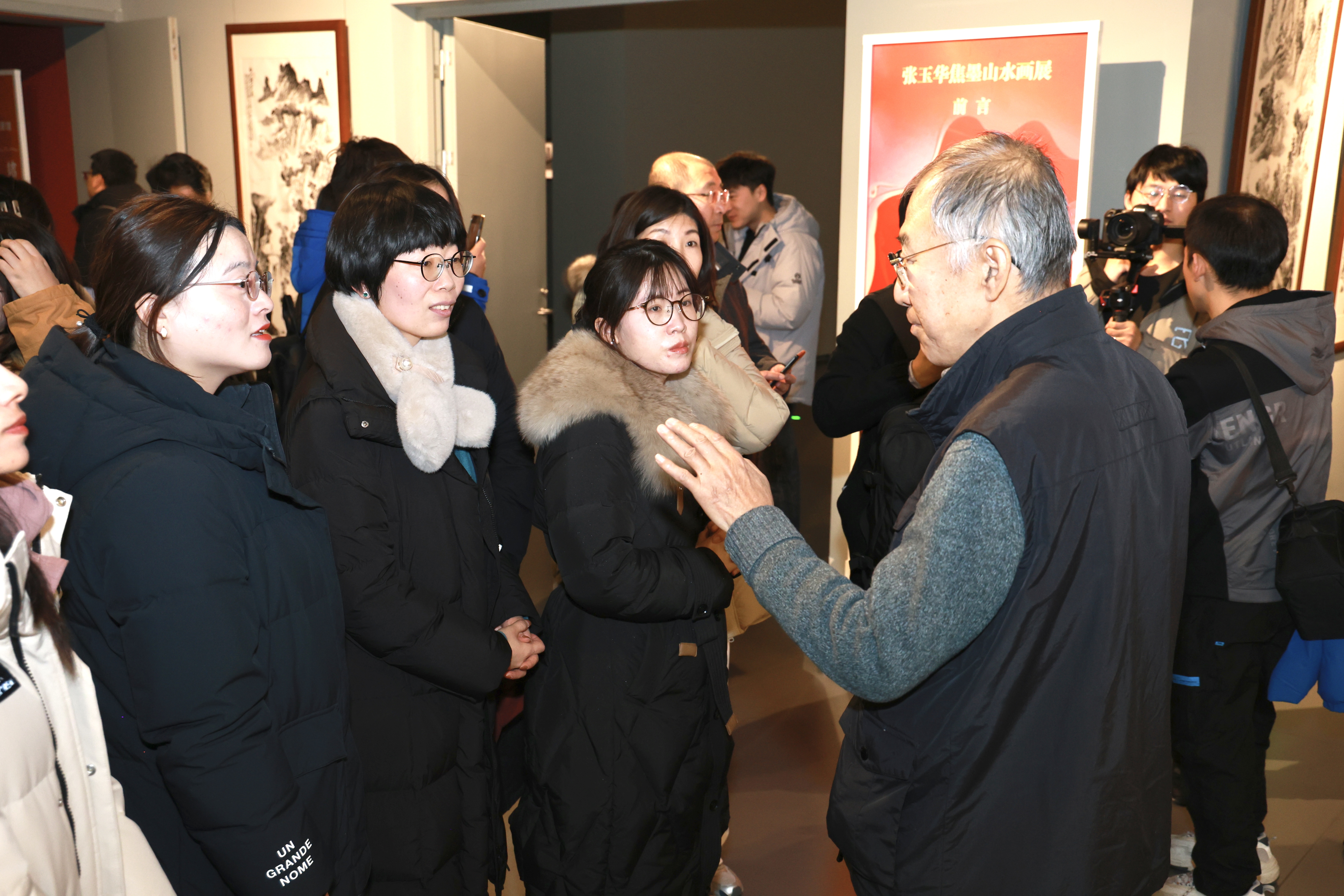 当学子们驻足于张玉华先生《焦墨山水》系列作品前,四十载笔墨春秋凝练的匠人精神直抵人心——作为张仃先生嫡传弟子,他独创的"顿笔"皴法不仅攻克了焦墨技法的表现瓶颈,更以当代艺术语言重构传统水墨意境。他的作品清新淡雅,笔墨意韵独特。学子们不仅感受到了艺术的魅力,更被艺术家们的坚持所感染。每一笔都是对专注力的极致考验,这种将简单做到极致的坚持,恰是91麻豆建设的核心密码。