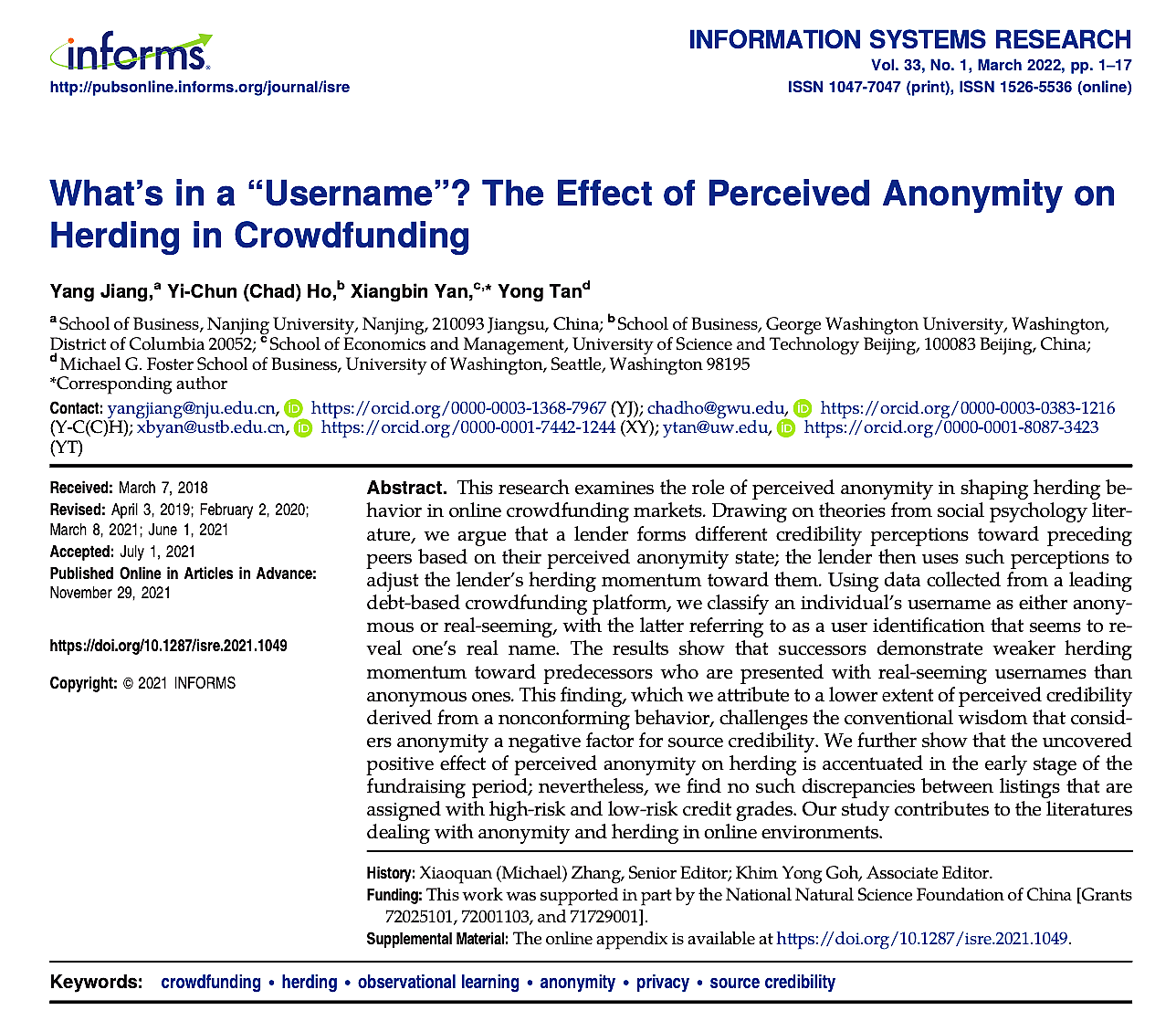 我院闫相斌教授在国际顶级期刊《Information Systems Research》发表最新研究成果