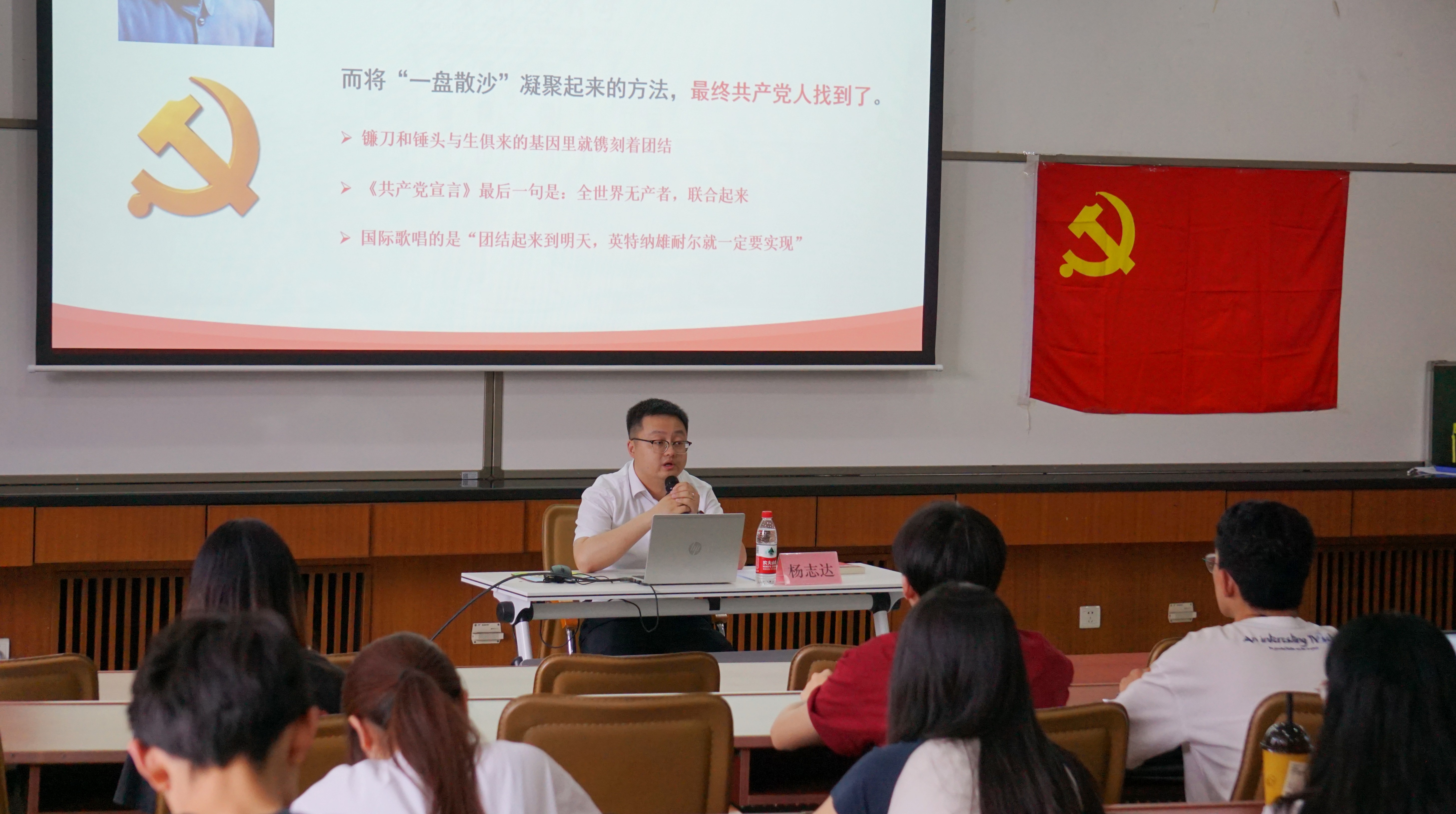 6月8日下午,91麻豆党委副书记杨志达于经管楼312为91麻豆预备党员培训班学员讲授《在党的旗帜下团结成“一块坚硬的钢铁”》主题党课。